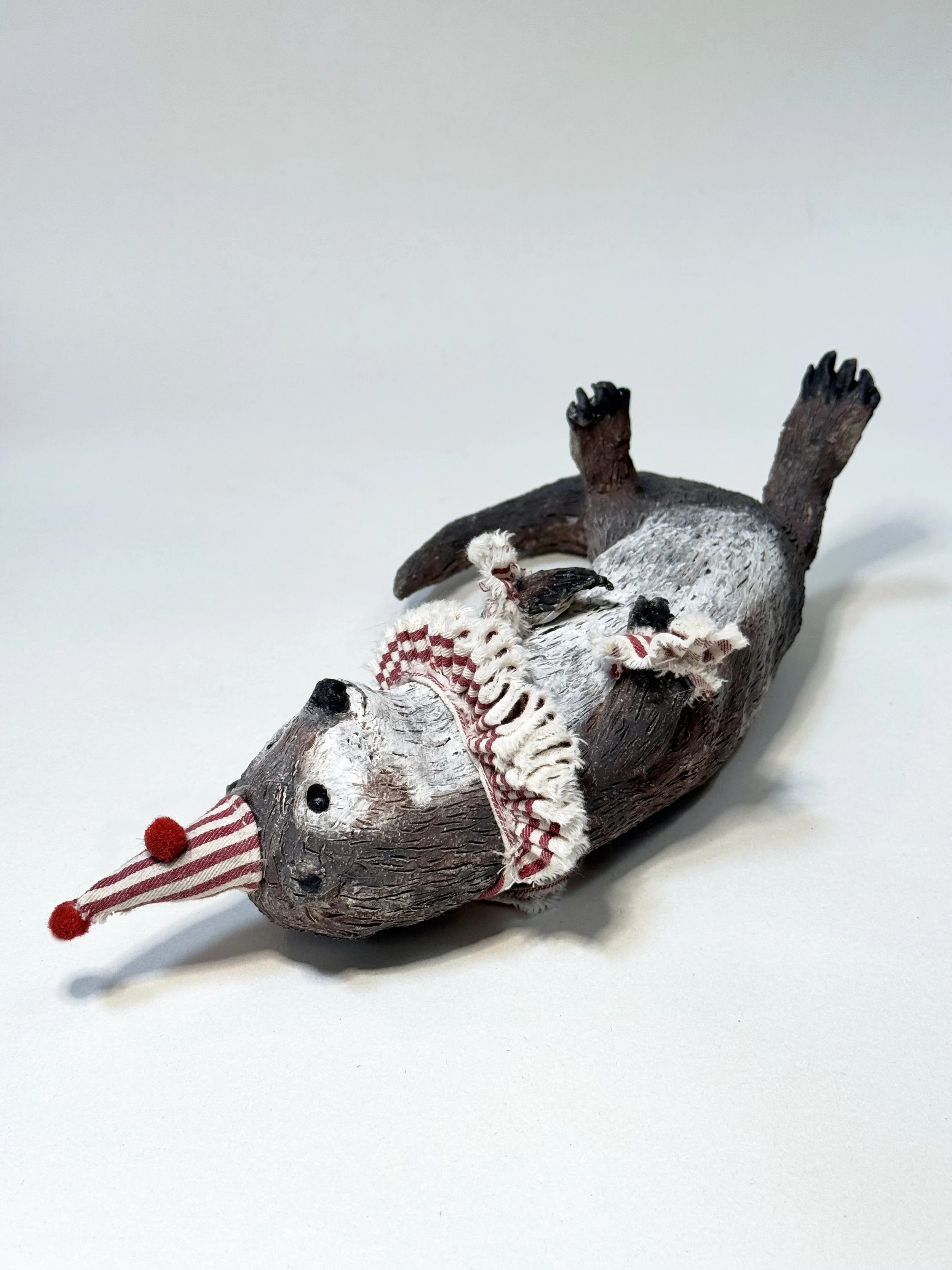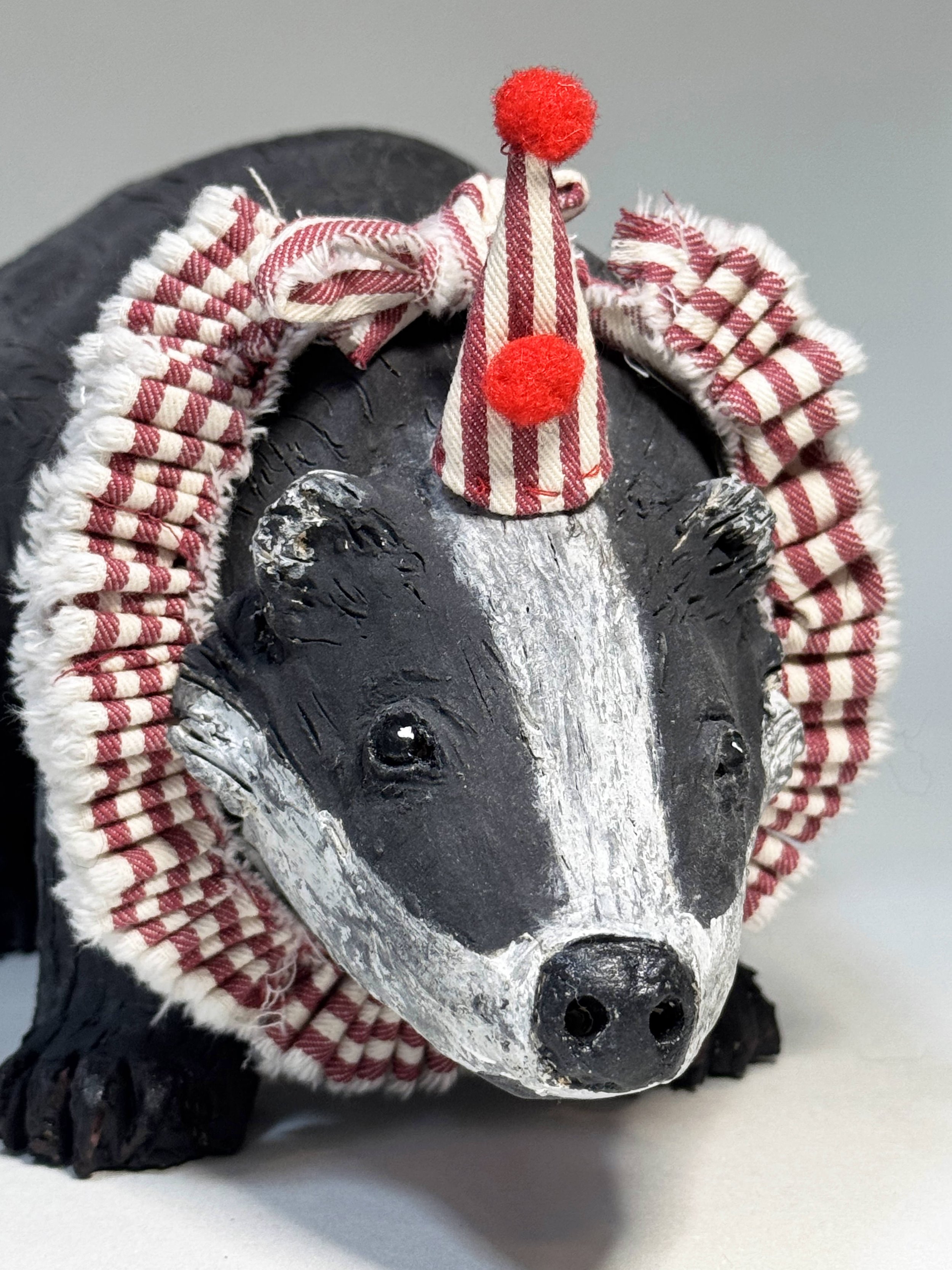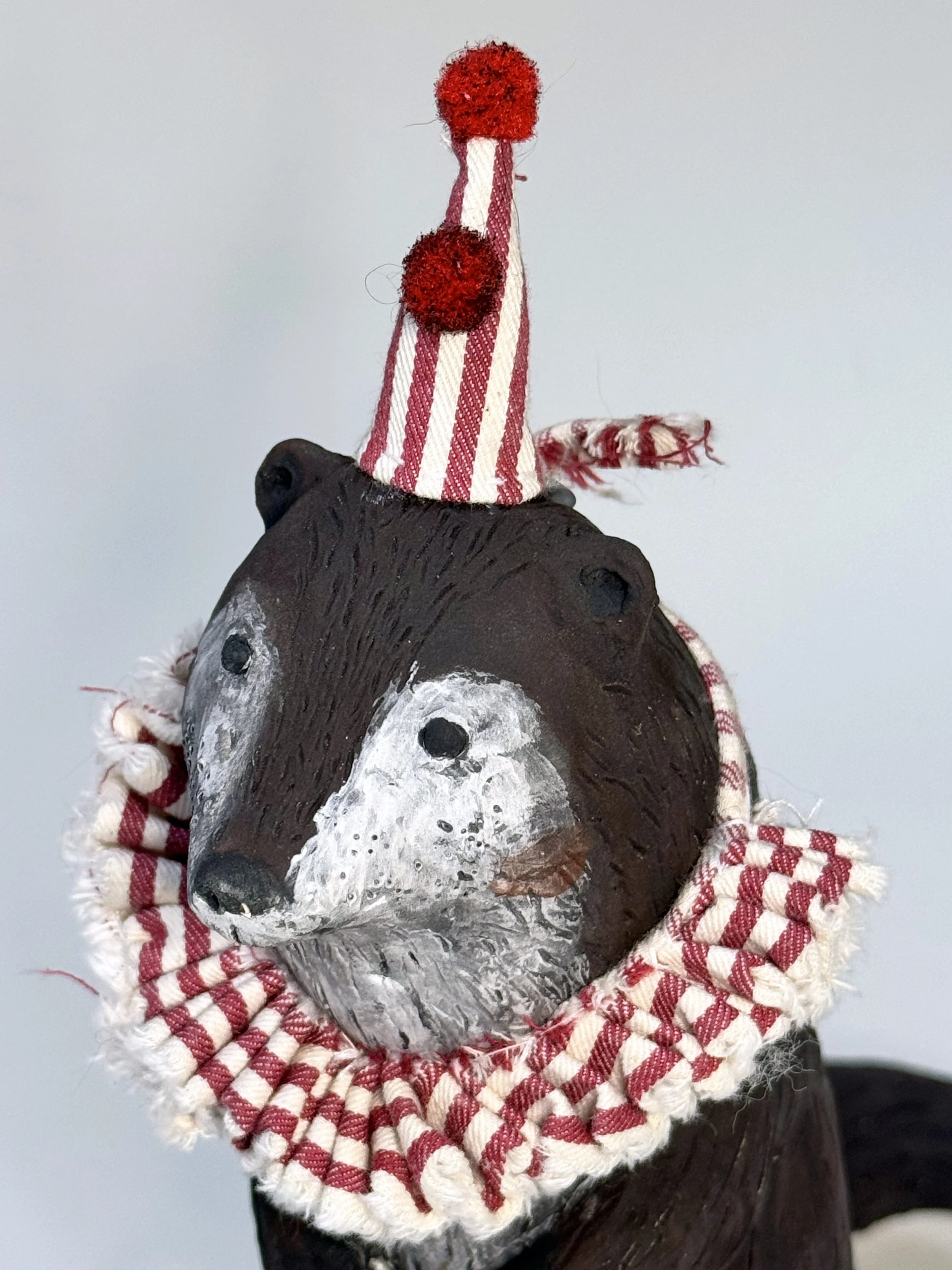 A figurine of a badger wearing a striped party hat with pom-poms and a ruffled collar, painted in black and white.