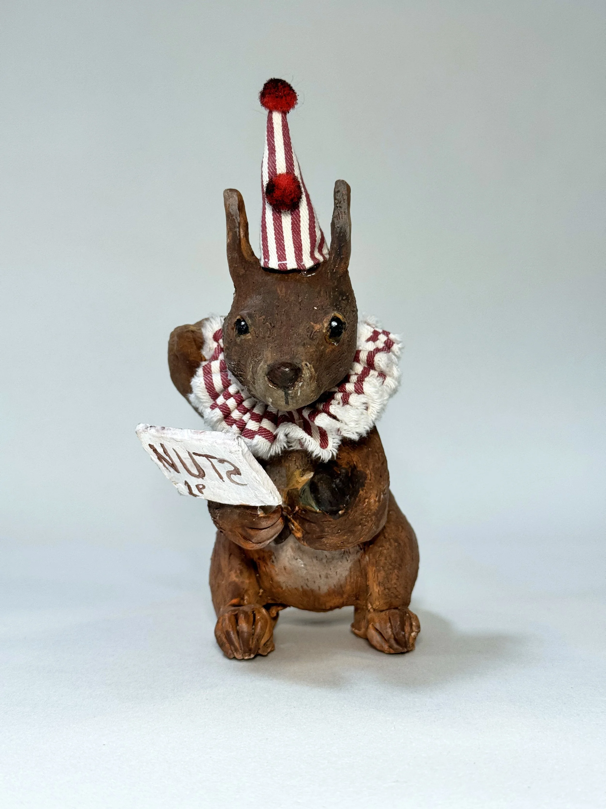 A small figurine of a squirrel dressed as a clown or show performer, wearing a striped hat with pom-poms, a ruffled collar, and holding a tiny sign that says 'STUN'.
