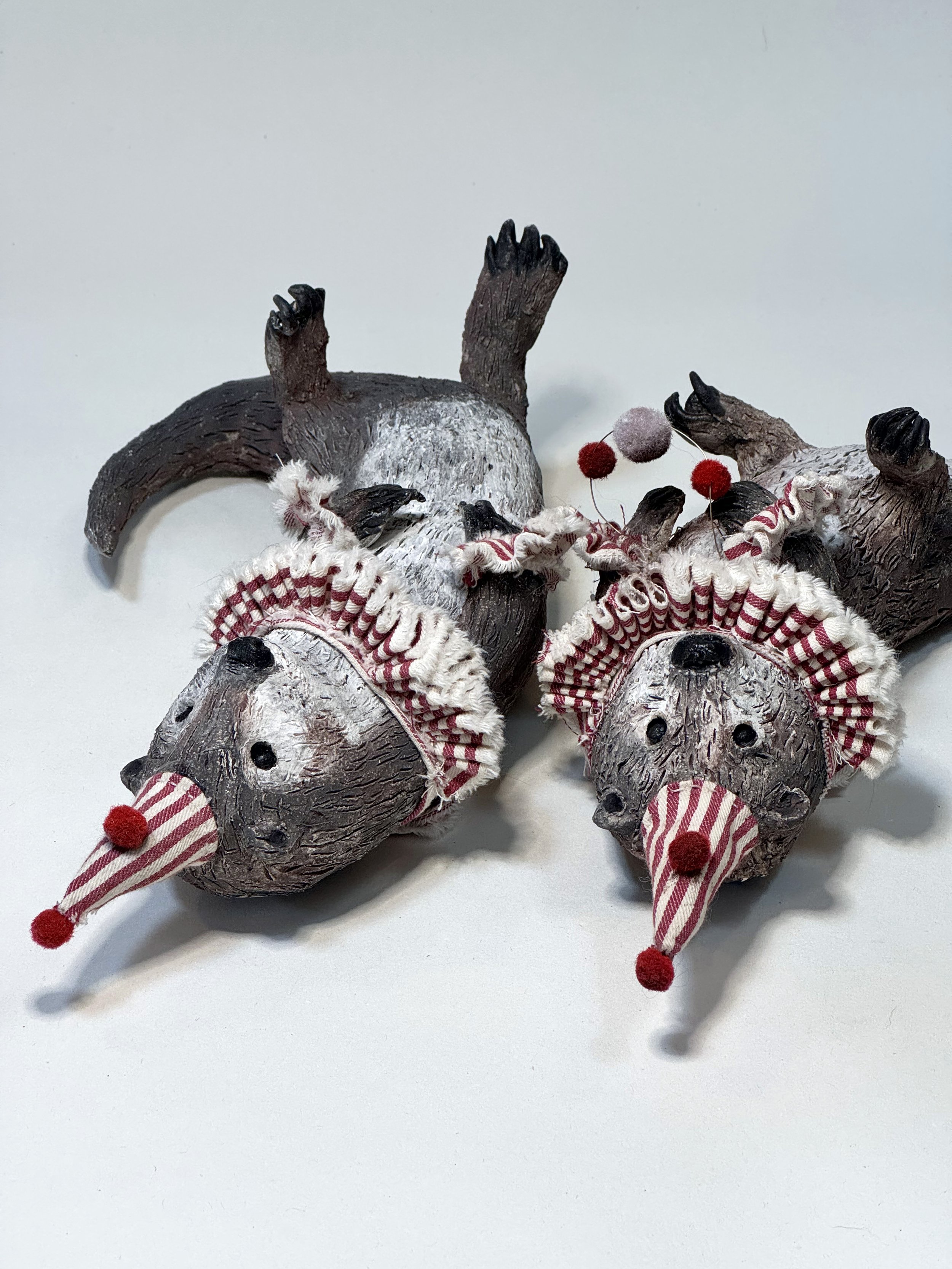 Two decorative hedgehog figurines dressed as clowns with red and white striped hats and ruffled collars, lying on a white surface.