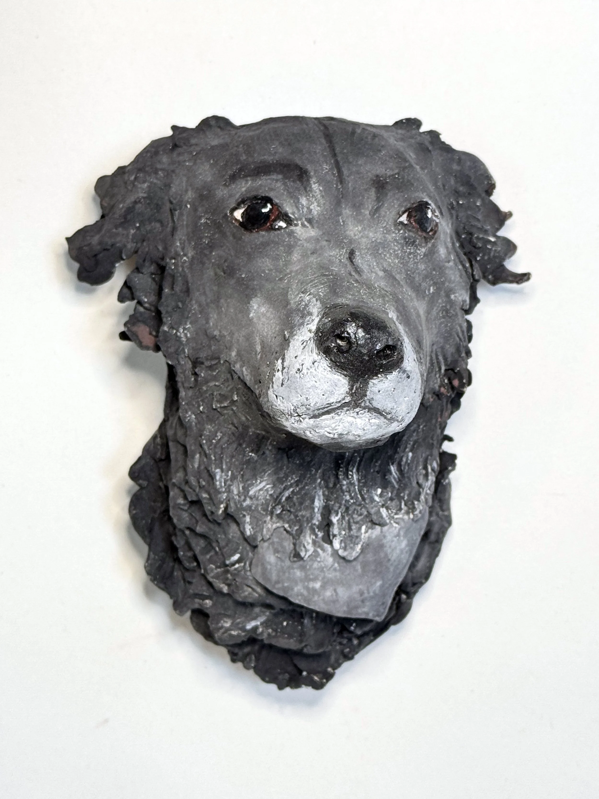 A detailed sculpture or painting of a black dog with a white snout, possibly a retriever or Labrador, on a white background.