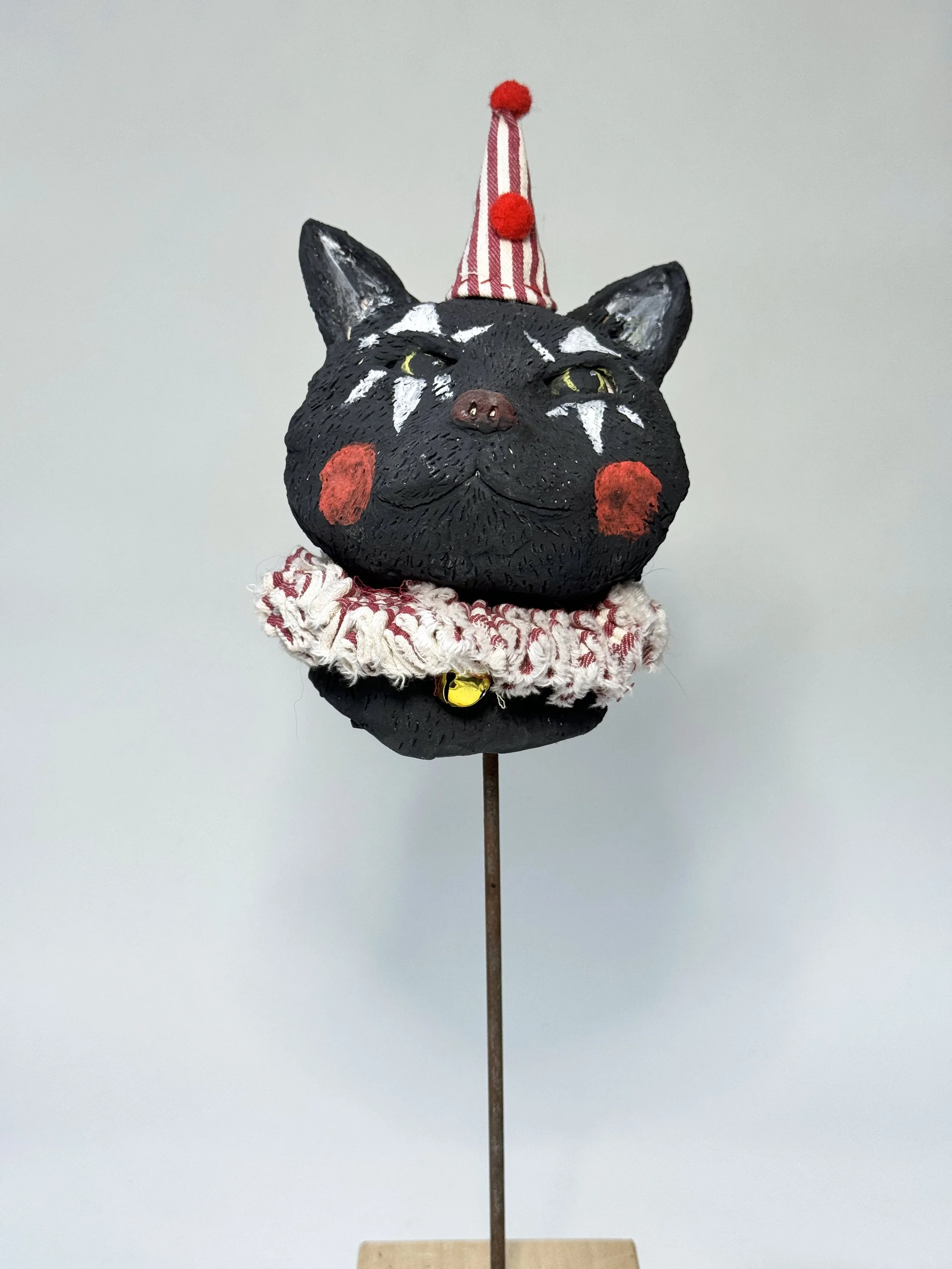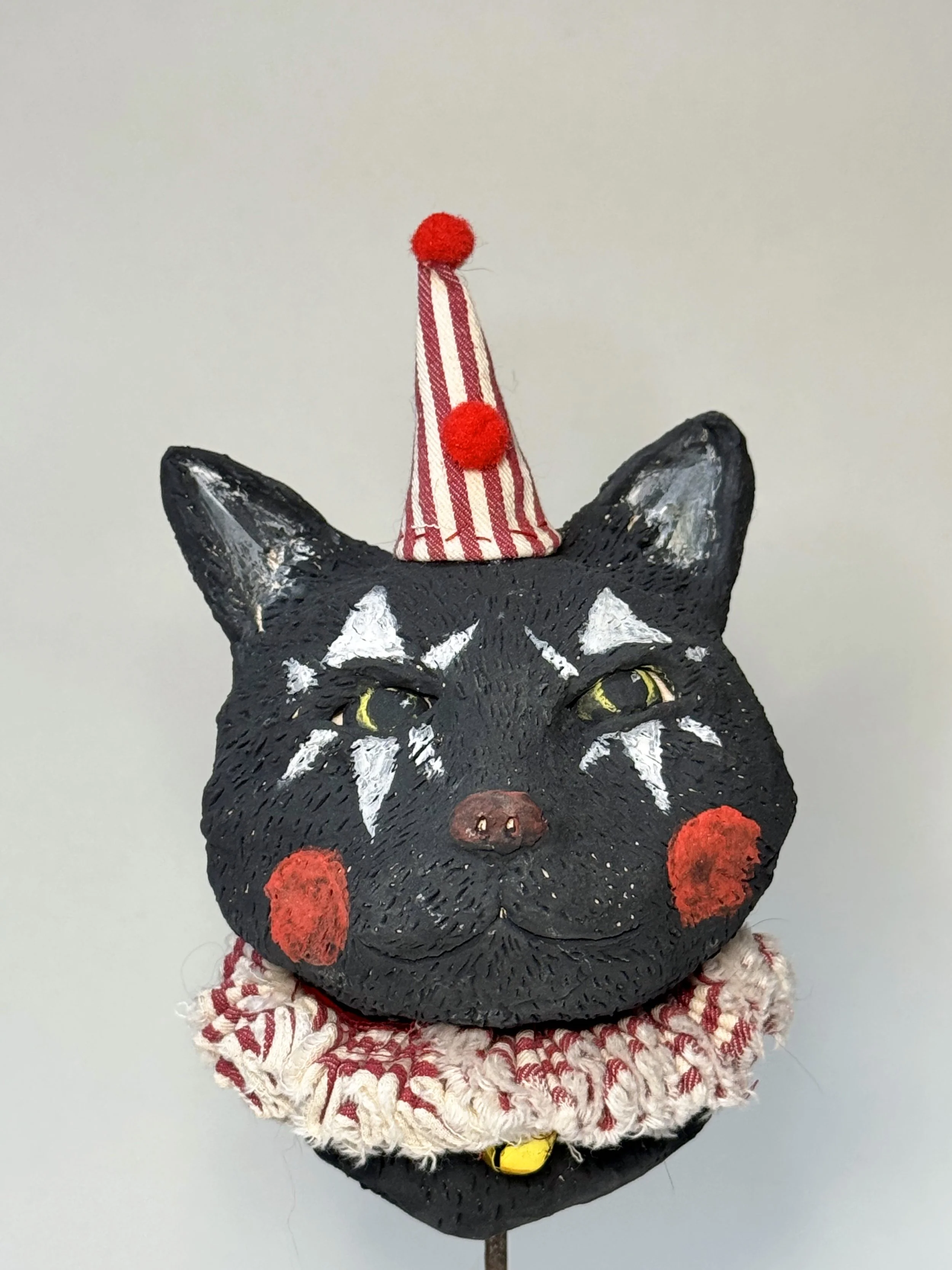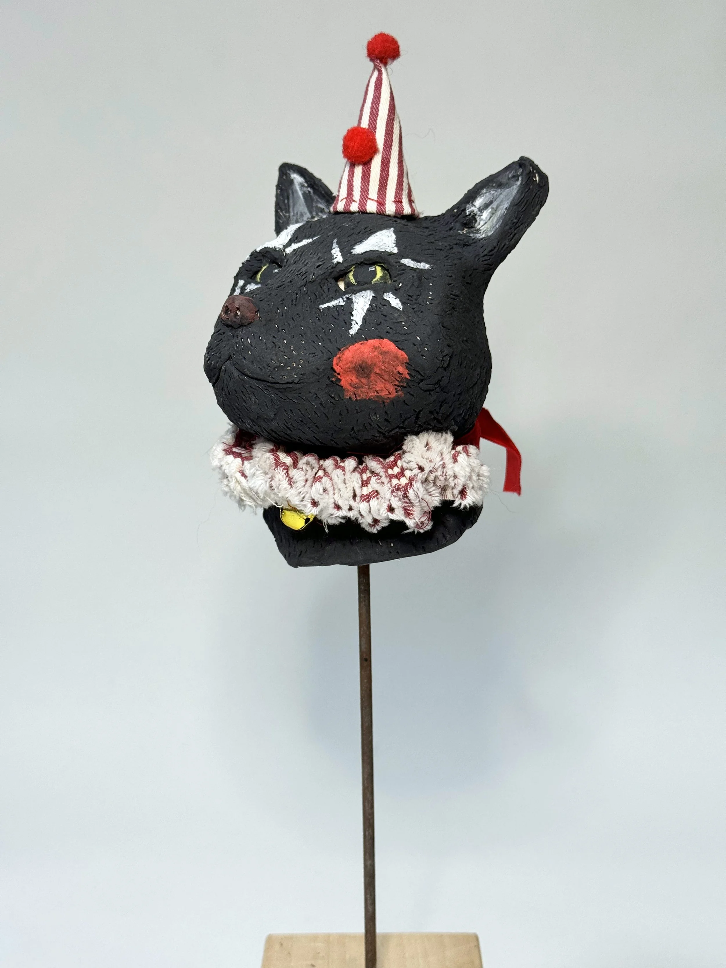 A black cat sculpture with a party hat and a fuzzy collar, mounted on a wooden block with a stick.