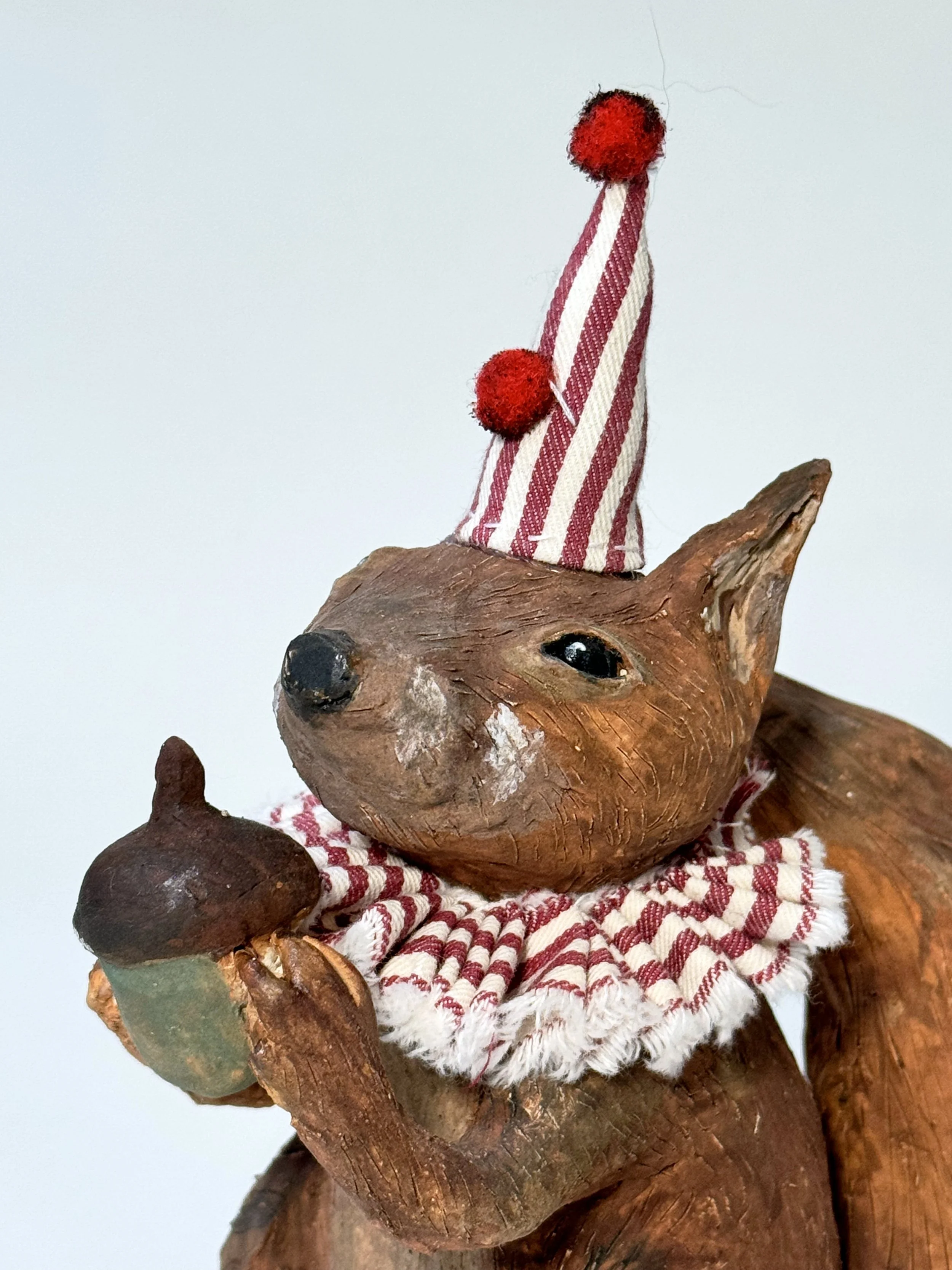 Wooden figurine of a squirrel wearing a striped hat with pom-poms, a ruffled collar, holding a small acorn, against a plain background.