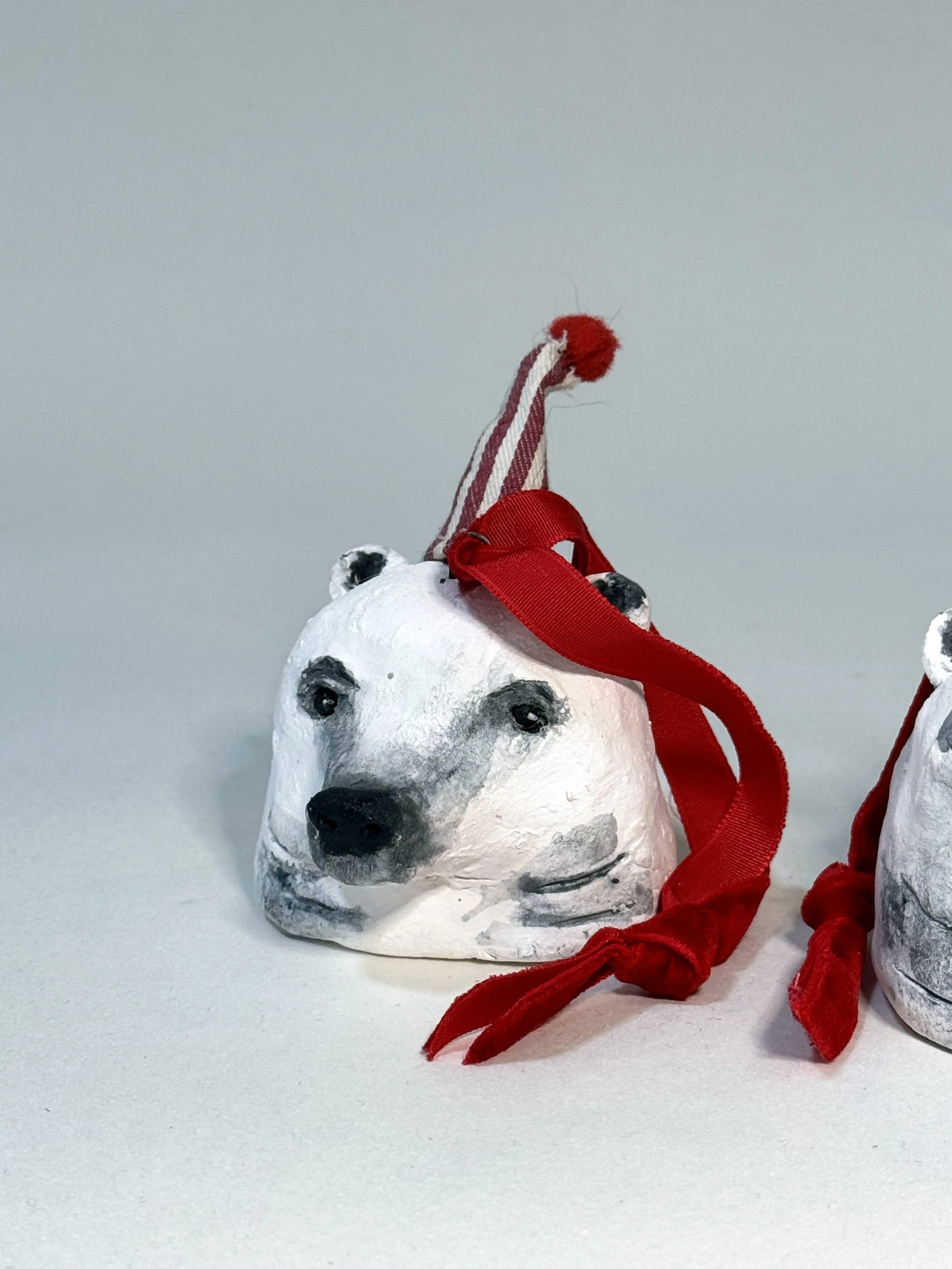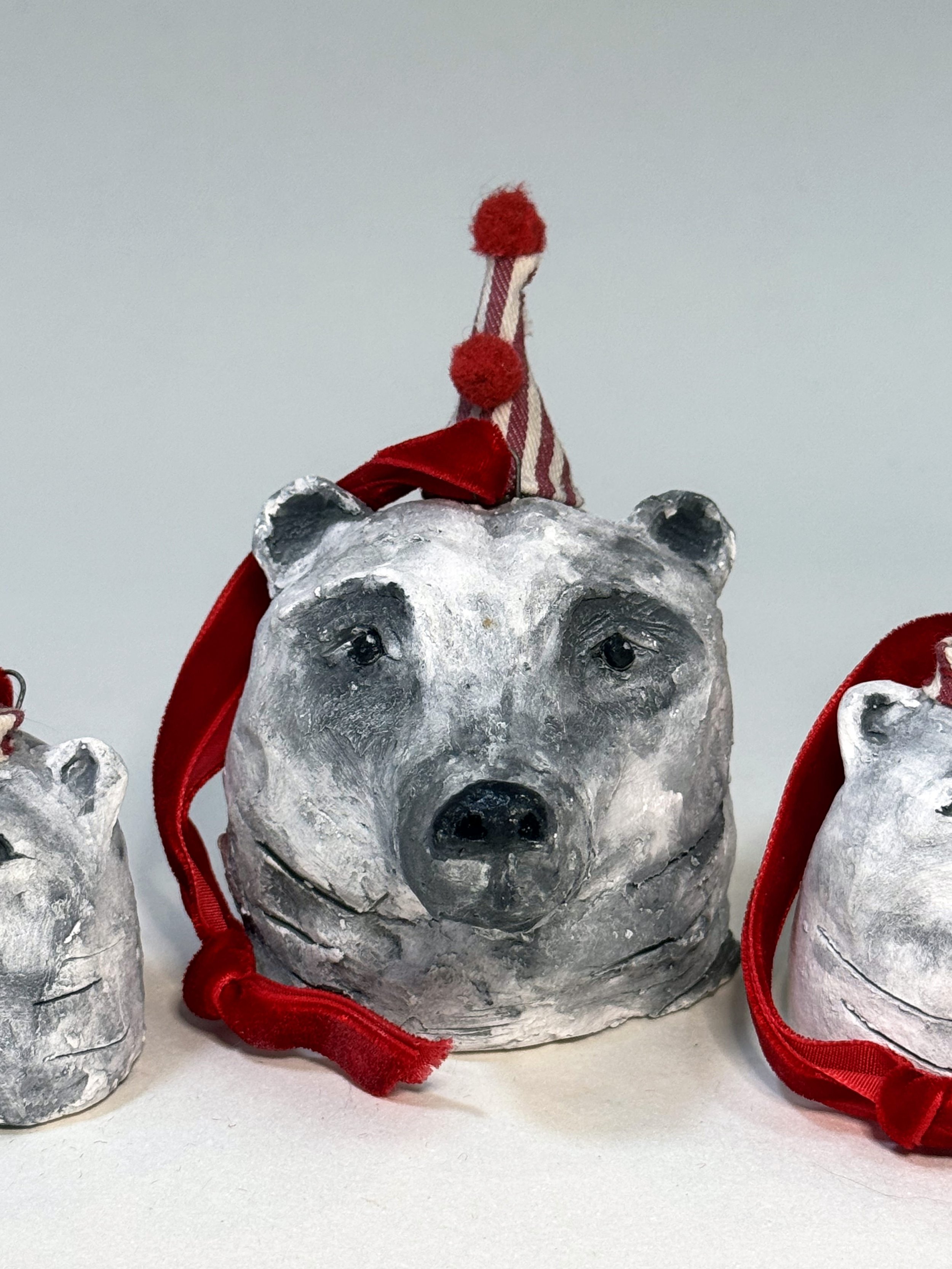 Decorative bear head sculpture with a red and white striped hat and a red ribbon, set against a plain background.