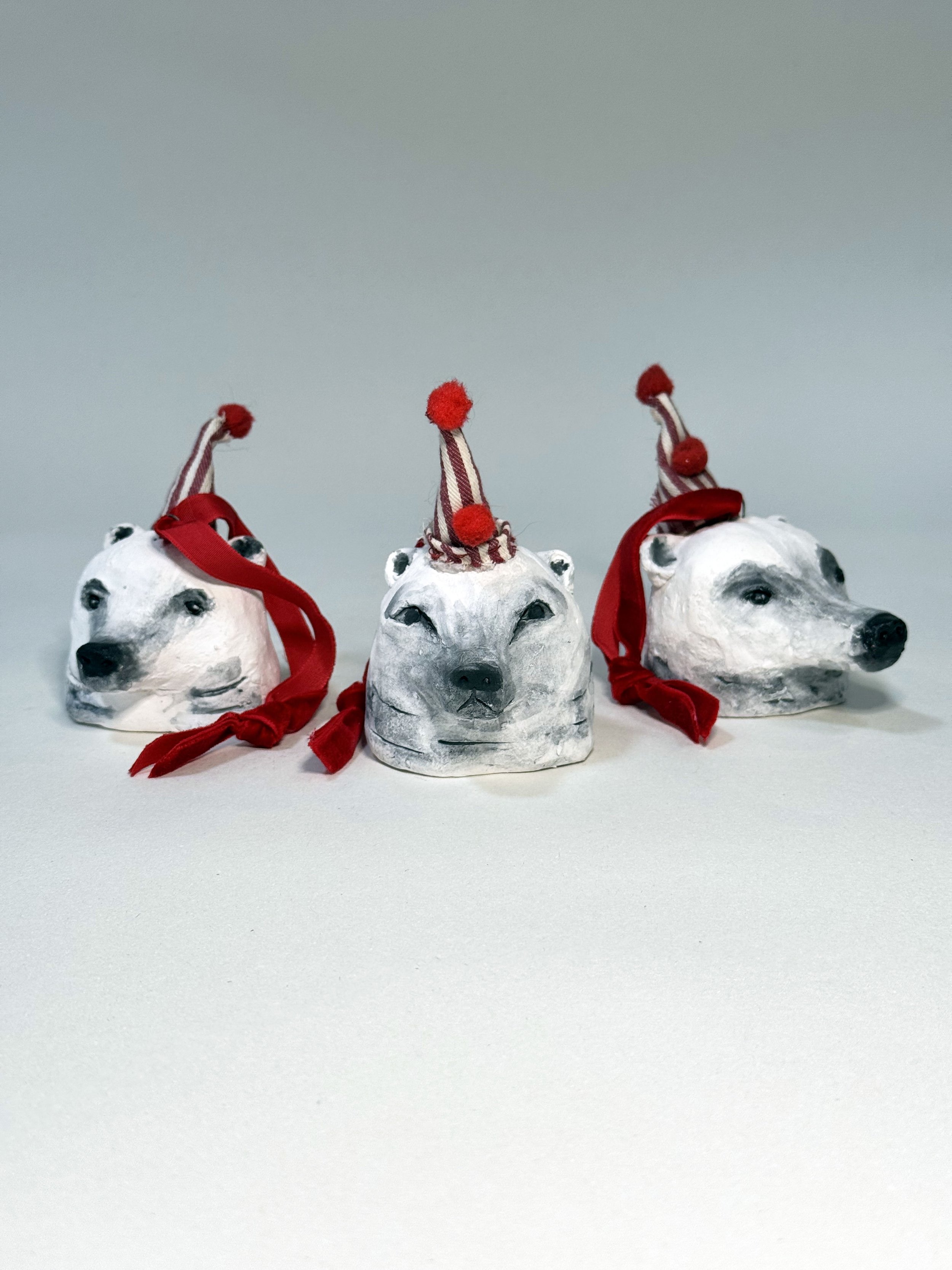 Decorative animal figures resembling bears wearing striped party hats with red pom-poms, and scarves, placed against a plain white background.