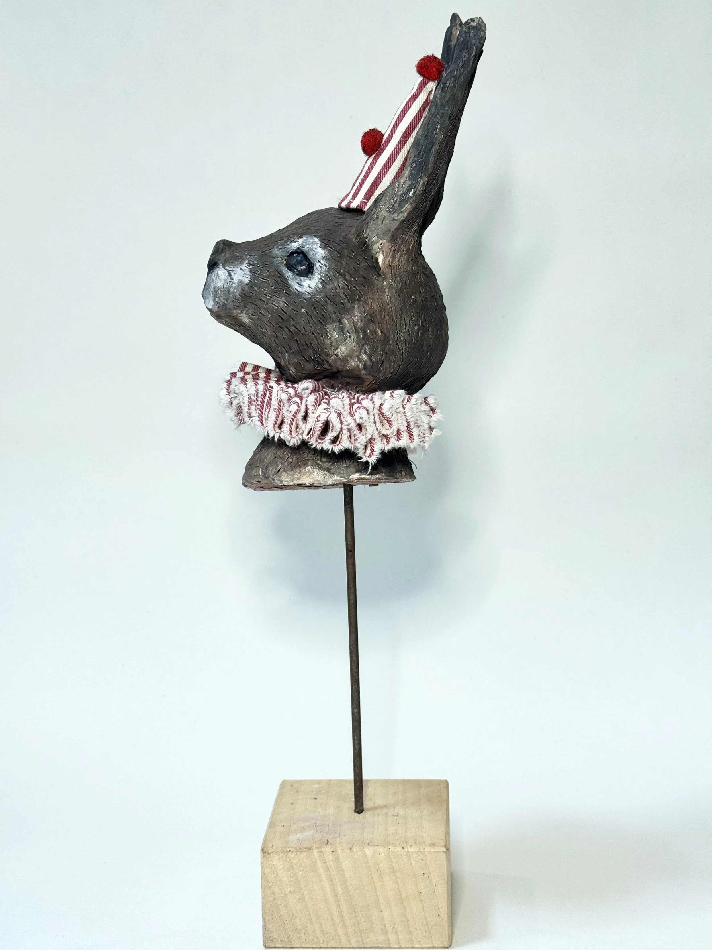 A sculpture of a rabbit's head with large ears, painted dark brown, wearing a striped party hat with pom-poms and a ruffled collar, mounted on a metal rod attached to a wooden block.