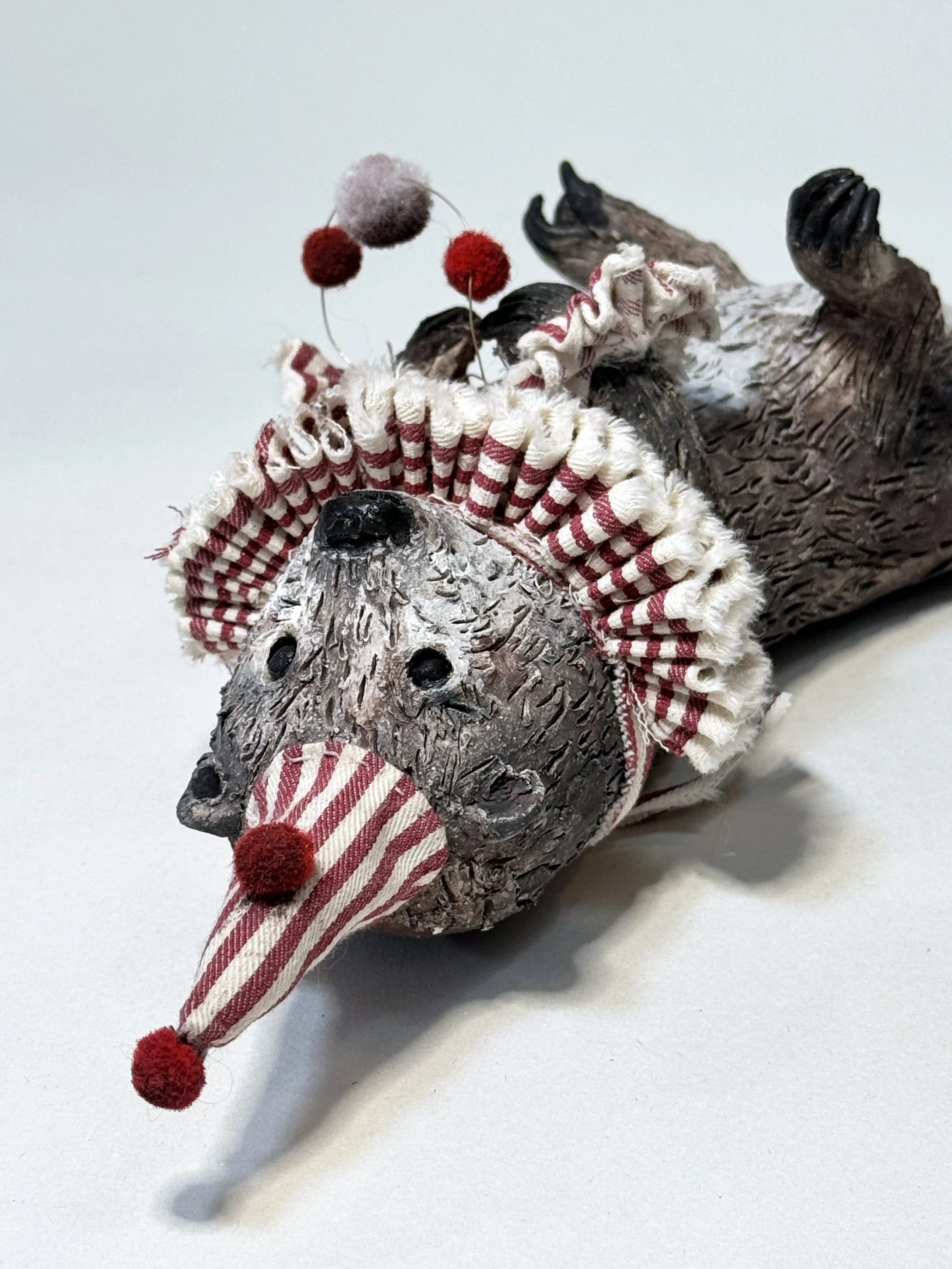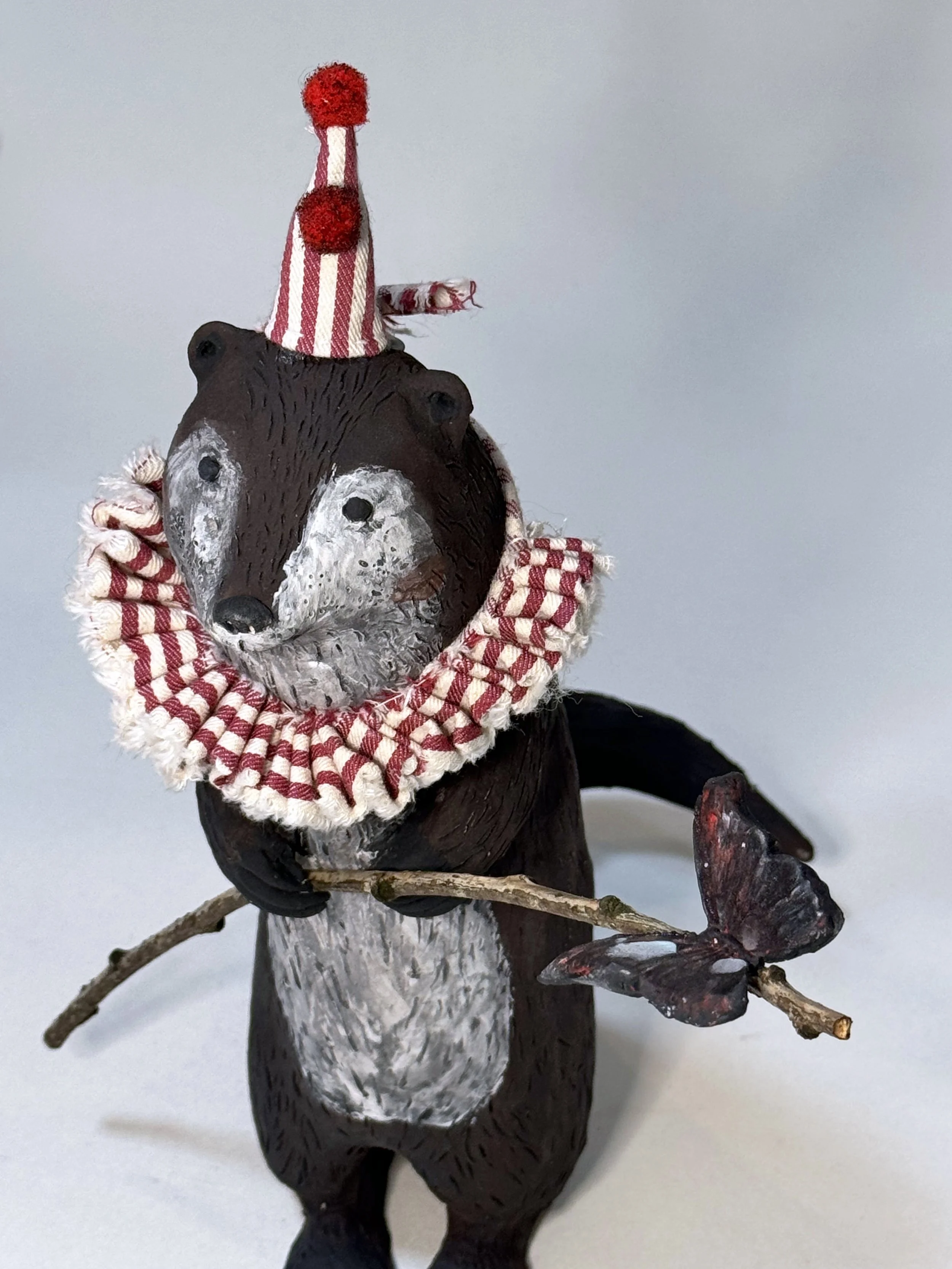 A handcrafted clay figurine of a bear dressed as a clown, wearing a striped jester hat with pom-poms, a ruffled collar, and holding a twig with a butterfly on it.