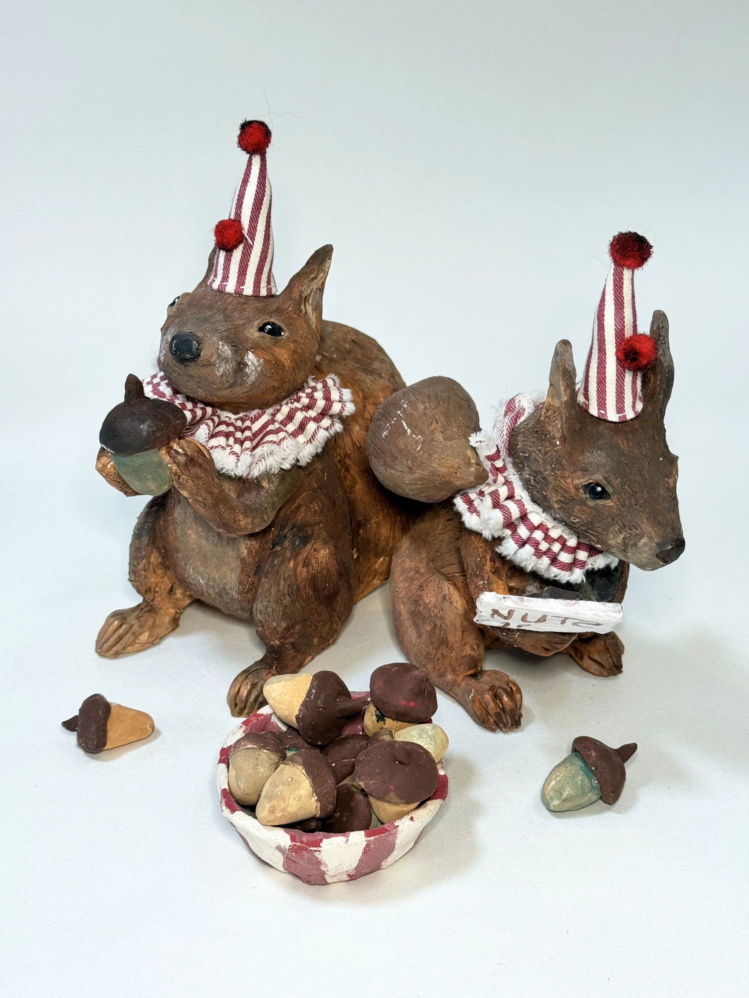 Wooden squirrel and fox figurines wearing red and white striped party hats and scarves, with a small bowl of nuts and scattered nuts in front.