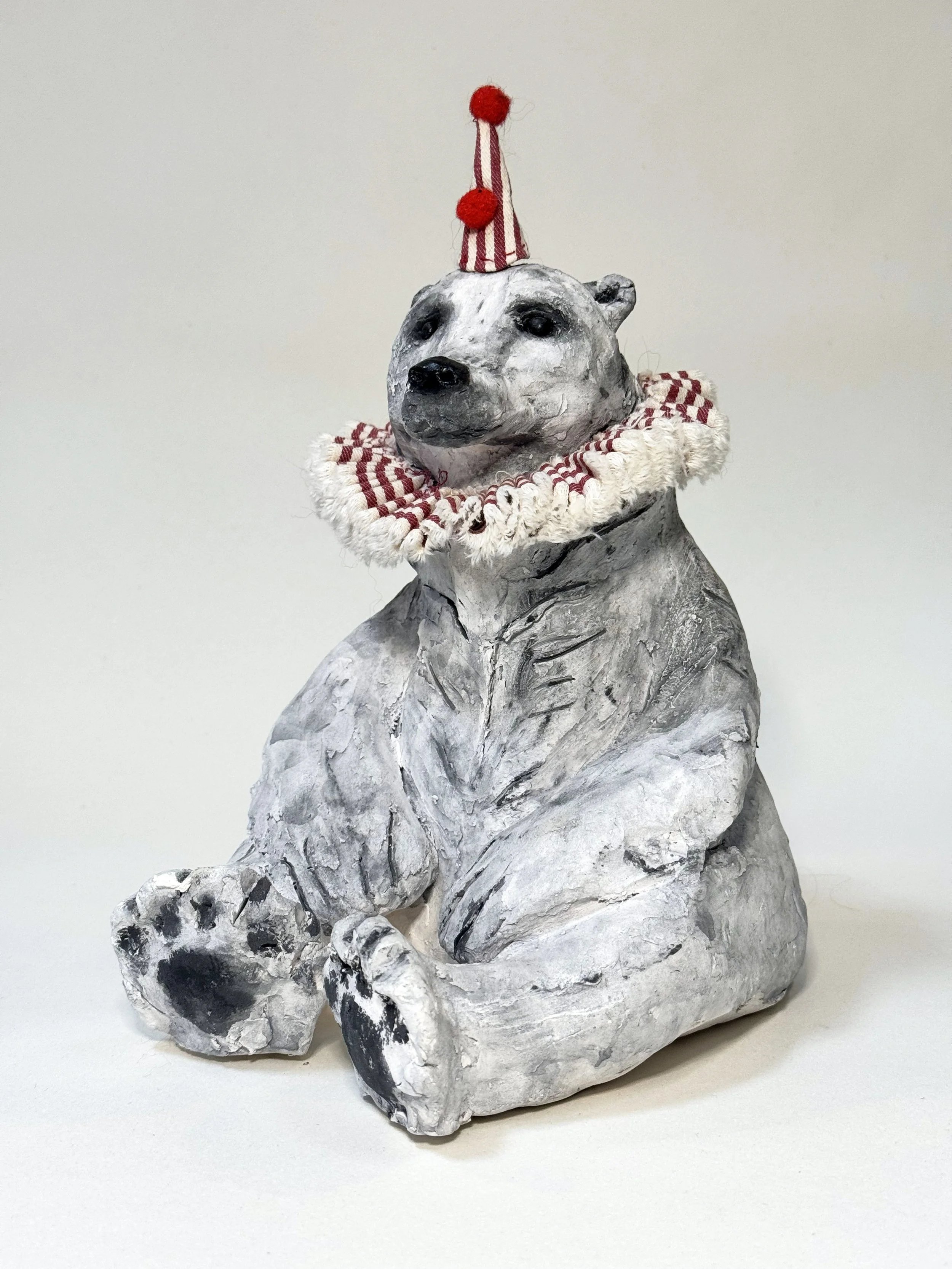 A painted sculpture of a sitting polar bear wearing a clown costume with a ruffled collar, a striped party hat with pom-poms, and black paw pads.