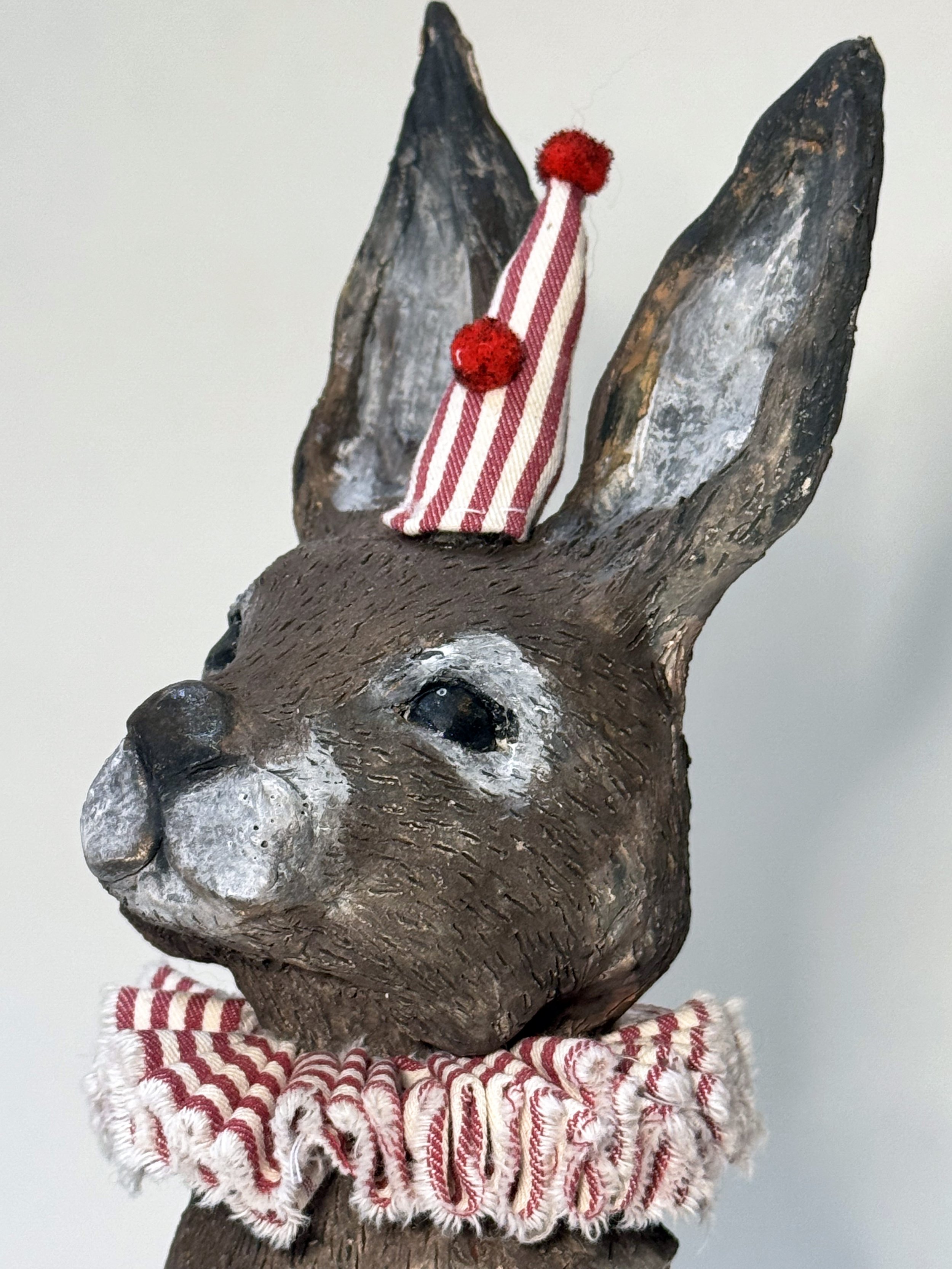 Decorative bunny sculpture with a striped hat and a ruffled collar.