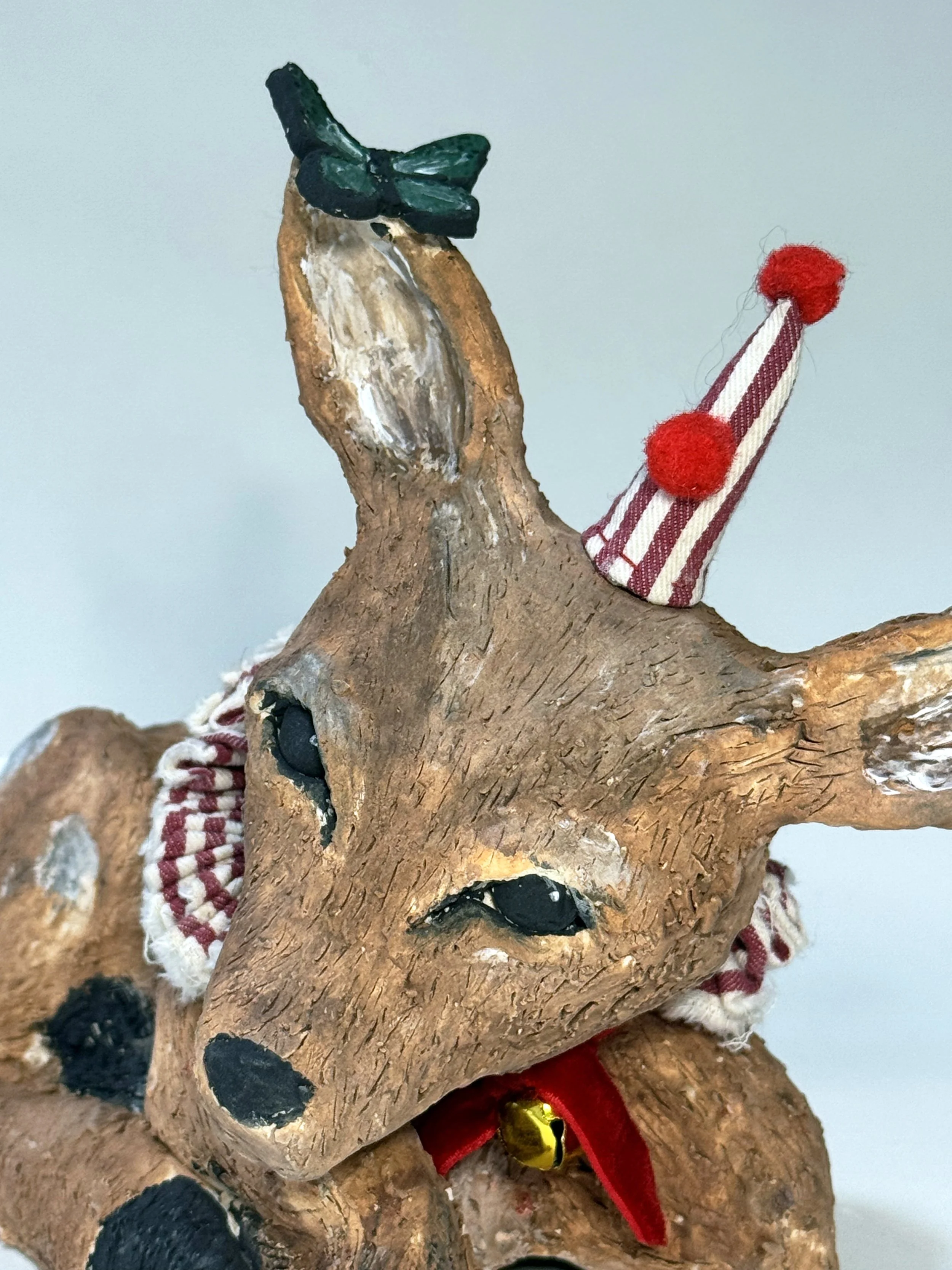 Decorative reindeer figurine made of wood, wearing a festive hat, a red ribbon, and a small black nose, with a small green hat on its head.
